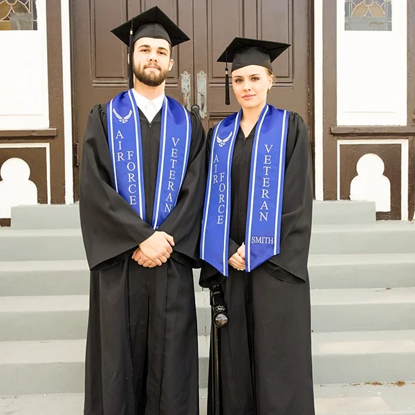 This stole is made from the finest satin just for graduating Air Force personnel. With chiseled cut edges and double borders, this stole is decorated beautifully with a high-quality embroidered Air Force crest.