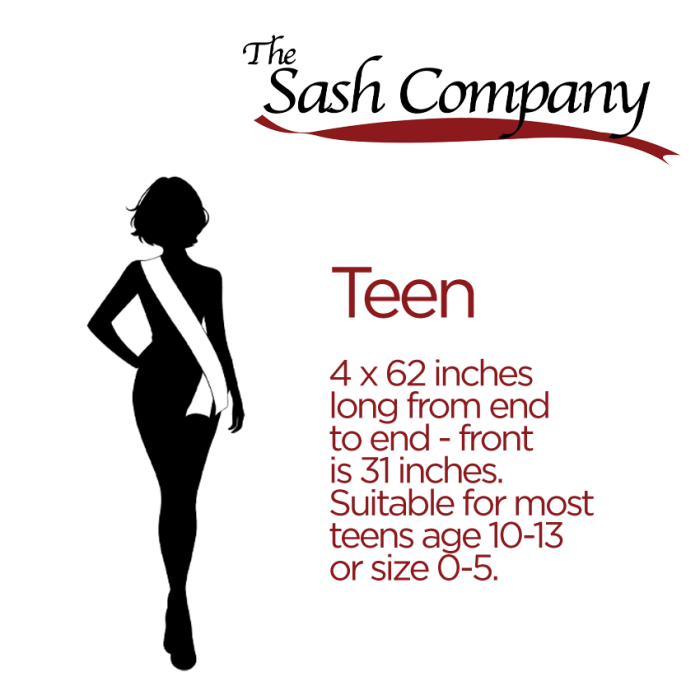 This Miss America's teen program sash for state competitions is sold in standard Adult size only, measuring 3.5" by 72" end to end. Front is 36 inches long.
