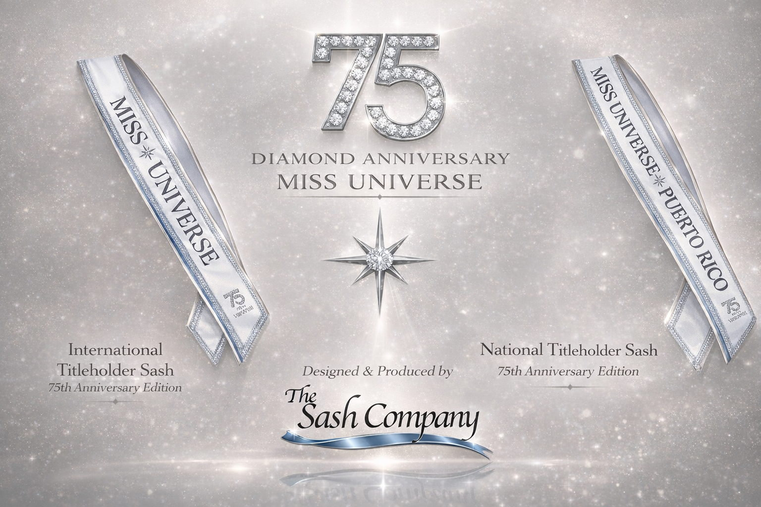 In honor of 75 years of Miss Universe, the Official Anniversary Sash was designed specifically for Miss Universe and national titleholders as part of this global milestone celebration.